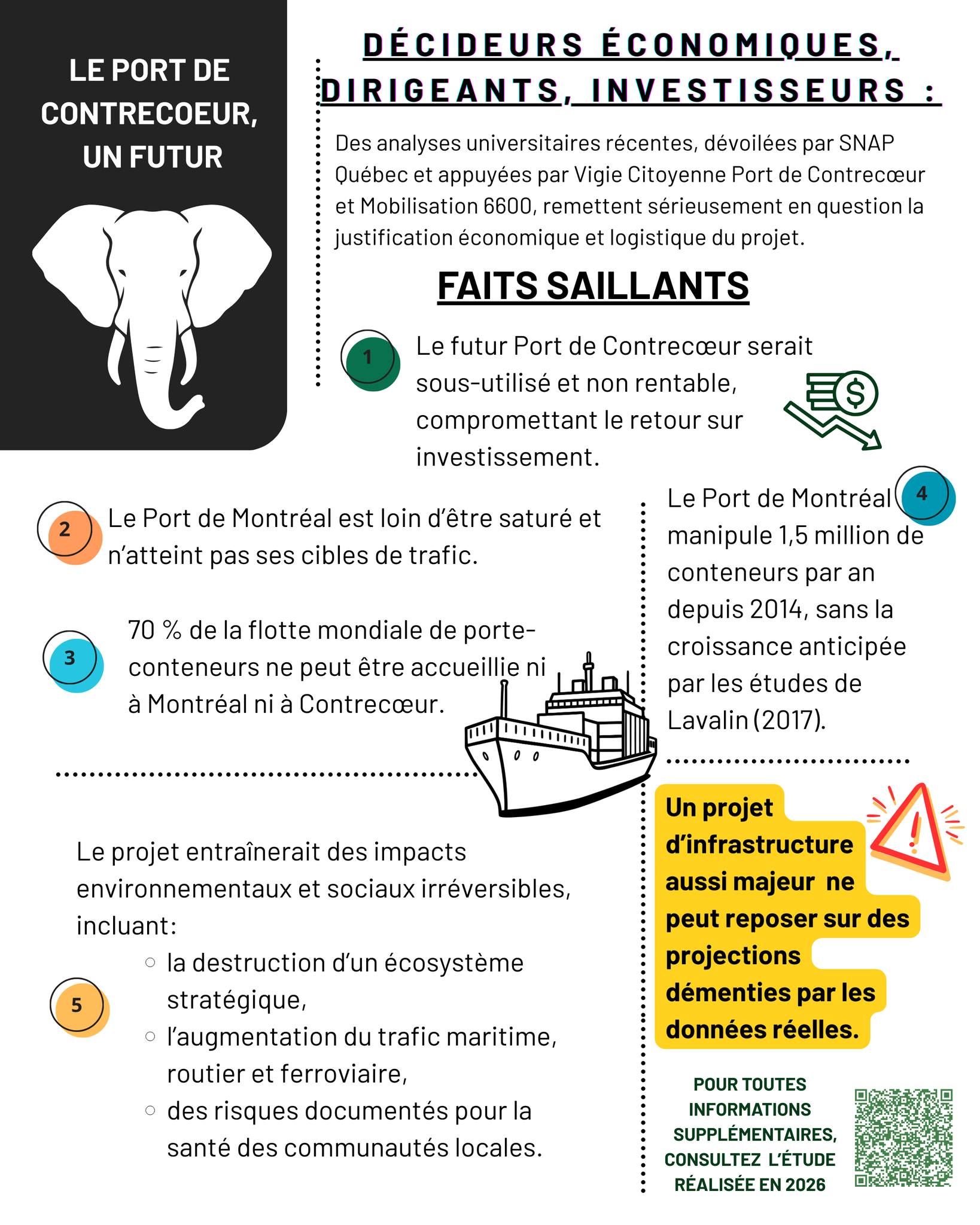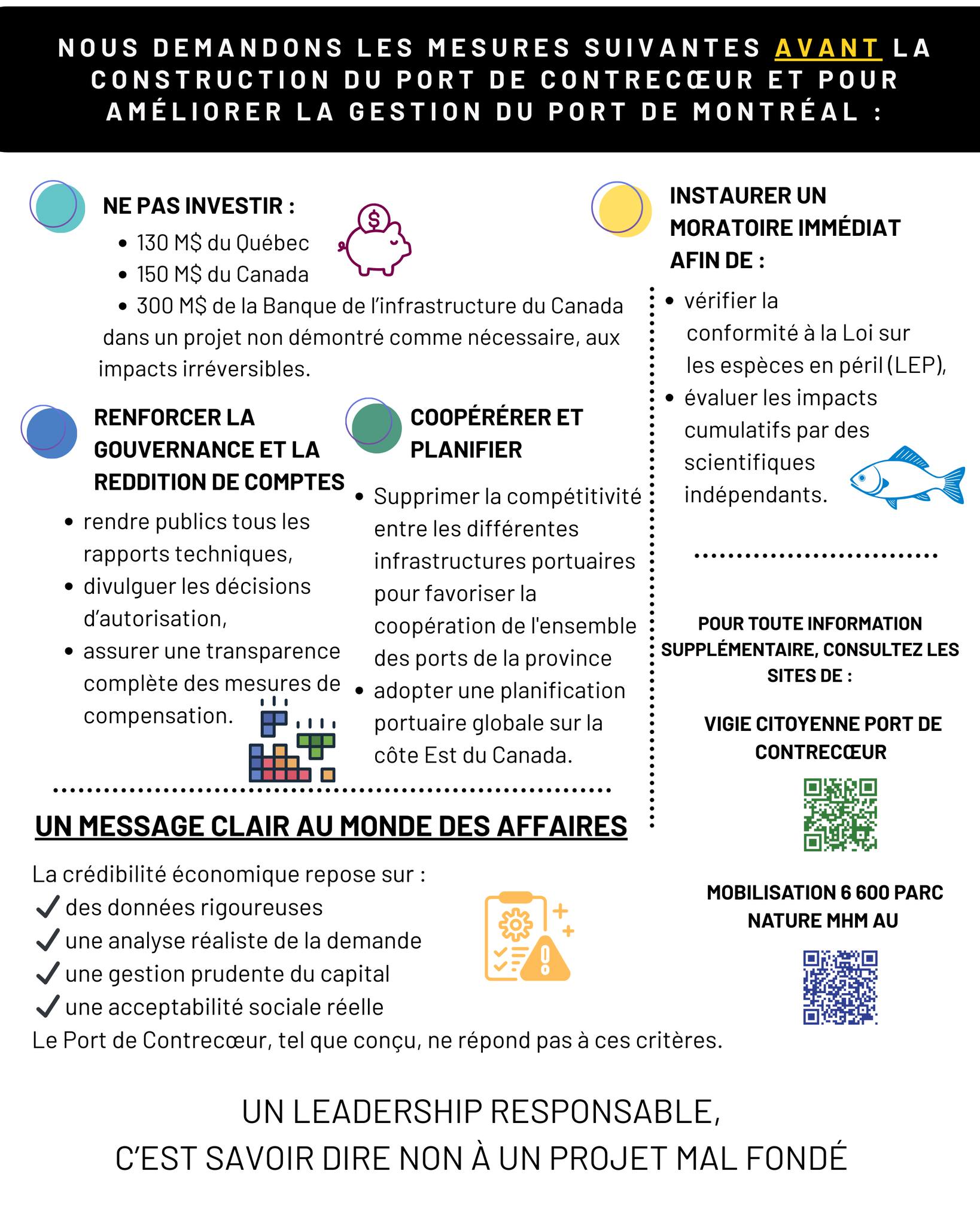 Alors que le port de Montréal est l’un des pires voisins industriels, qui impose aux quartiers avoisinants une cohabitation déficiente (bientôt la pire au monde selon l’observatoire des milieux de vie!), malgré qu’il soit en sous capacité. Alors que le port fait déjà des pressions insurmontables sur les milieux naturels et le fleuve, l’administration s’entête à pousser des projets d’agrandissement sans aucun argument économique.