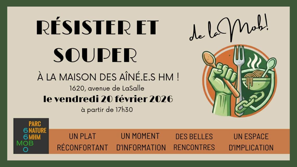 Nous vous invitons à venir manger et discuter, passer du bon temps et s’organiser. Bref, c’est une invitation à Résister et souper !