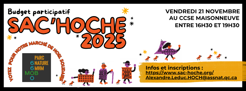 Marché de Noël solidaire sur la Friche à défendre 🎄 Mobilisation 6600 revient cette année avec un marché de Noël festif et familial sur notre belle Friche à défendre !L’édition 2025 sera placée sous le signe de la solidarité et de l’entraide, avec notamment une soupe populaire et plusieurs actions en soutien aux personnes vulnérables. Pour nous aider à financer à ce projet, nous participons au Budget participatif Sac’Hoche. Avec votre aide, nous pourrions obtenir 1000 $ ! 👉 Rendez-vous le 21 novembre au CCSE Maisonneuve pour découvrir notre initiative et voter pour nous ! Pour en savoir plus sur le budget Sac’Hoche : www.sac-hoche.org/sachoche-2025